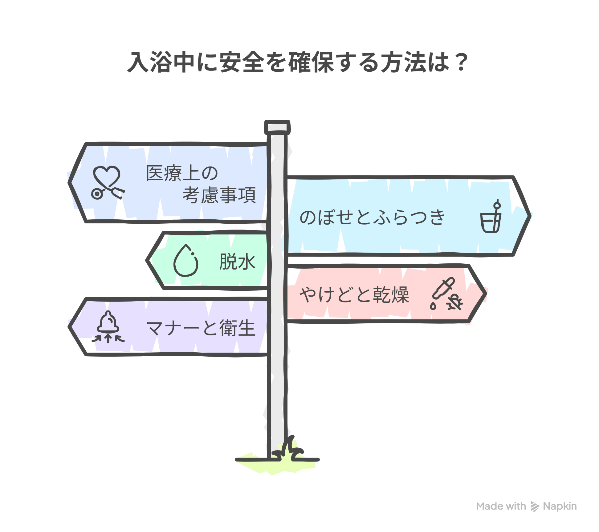 - 脱水:入浴の前後にコップ1杯の水分補給を。飲酒直後の入浴は避けます。